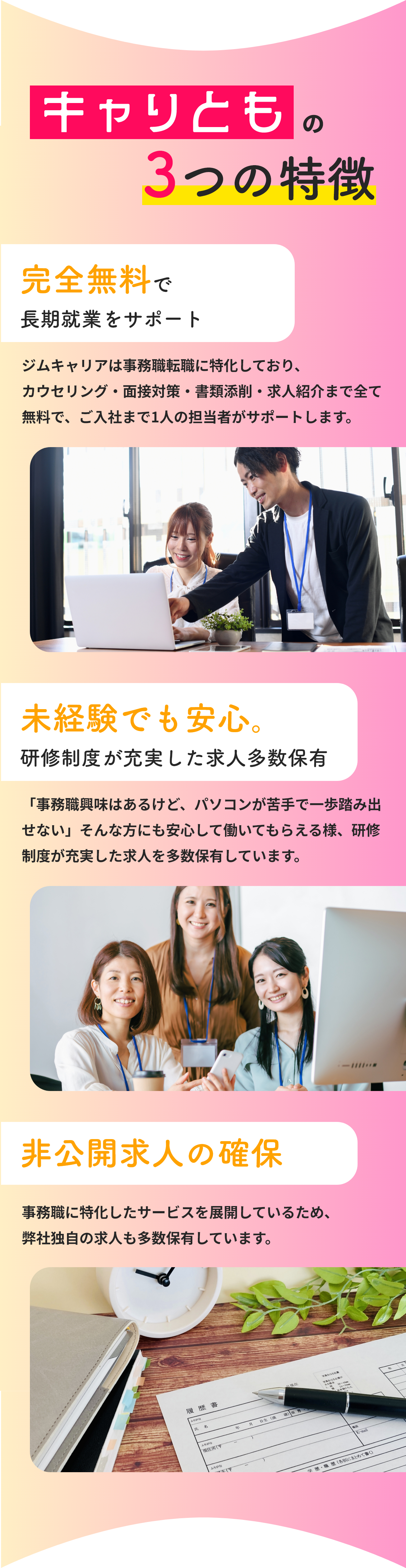 ジムキャリアからご入社された方の8割がパソコンをお持ちでなく、完全未経験からのスタートです。研修制度の充実した求人だけをご紹介するので安心して働けます。